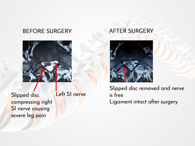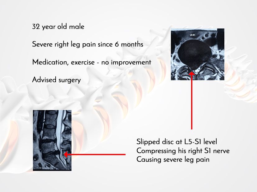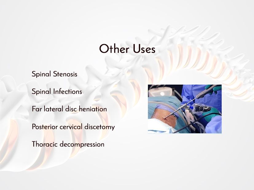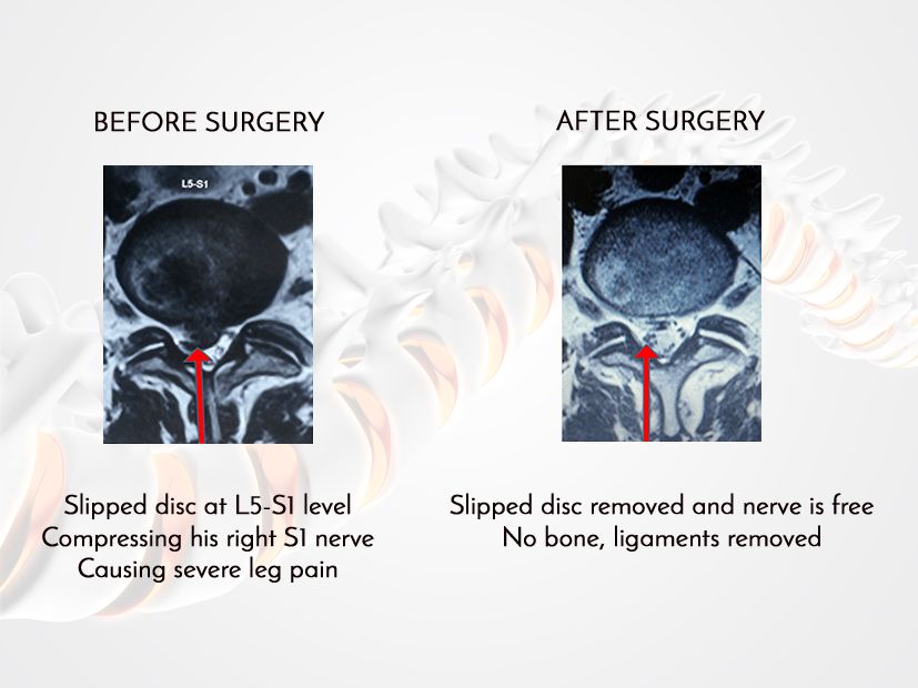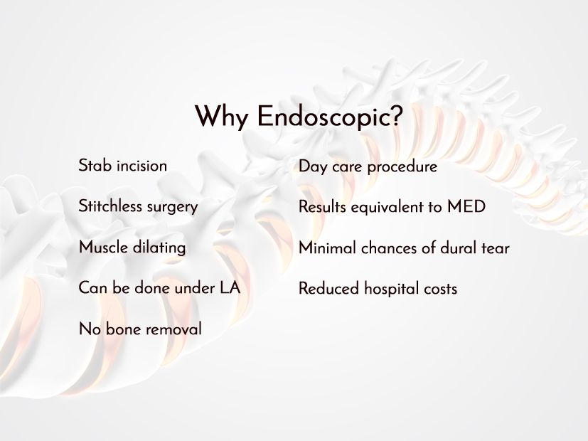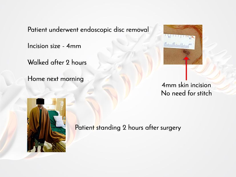 Slipped disc is one of the most common causes of back and leg pain. Majority of patients get better with physiotherapy. Traditional surgery for prolapsed disc entails dissection of muscles, bone and ligament removal. Commonly used techniques are microdiscectomy (using microscope), MED ( using tubes and microscope). However, since these techniques entail removal of normal anatomical structures it may lead to more post operative pain, infection, bleeding and longer recovery