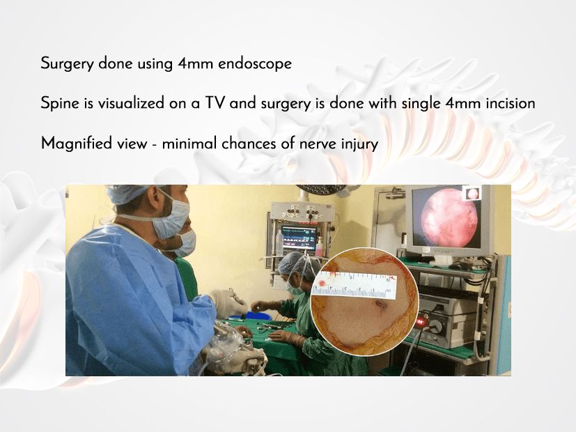 It is done either using an interlaminar approach or percutaneous transforminal approach. A single stab incision is taken and a 3.5- 4mm endoscope is inserted at the pathological level. Whole surgery is done through this endoscope with visualization on a high definition TV . Transforaminal approach can be done under local anesthesia. Patients are discharged the same day.